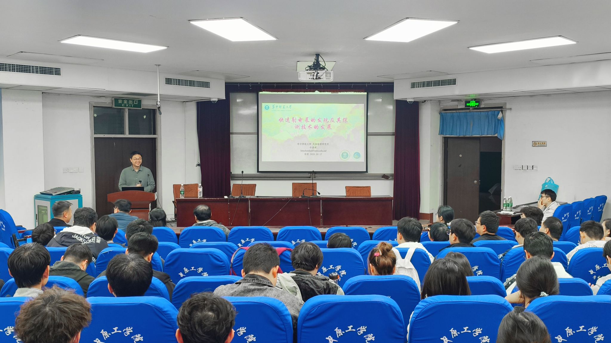 报告会上,牛晨辉系统梳理了快速射电暴(FRBs)的研究进展与观测现状,详细介绍了国际主流射电望远镜在FRB探测方面的最新进展,并重点展示了基于中国“天眼”FAST望远镜所开展的FRB搜寻工作与技术手段。这些兼具科学前沿性与探索魅力的成果,深深吸引在场师生。参会师生围绕FRB的物理起源、探测技术前景等问题,与牛晨辉展开热烈交流,现场学术氛围浓厚。